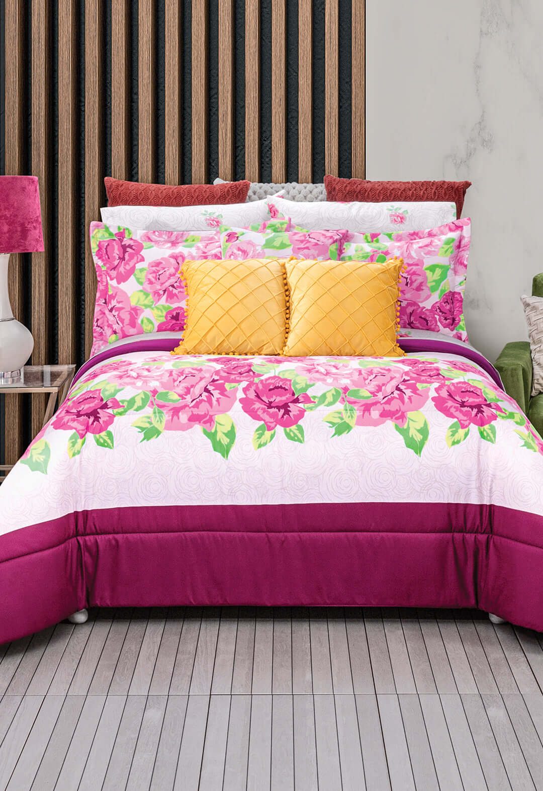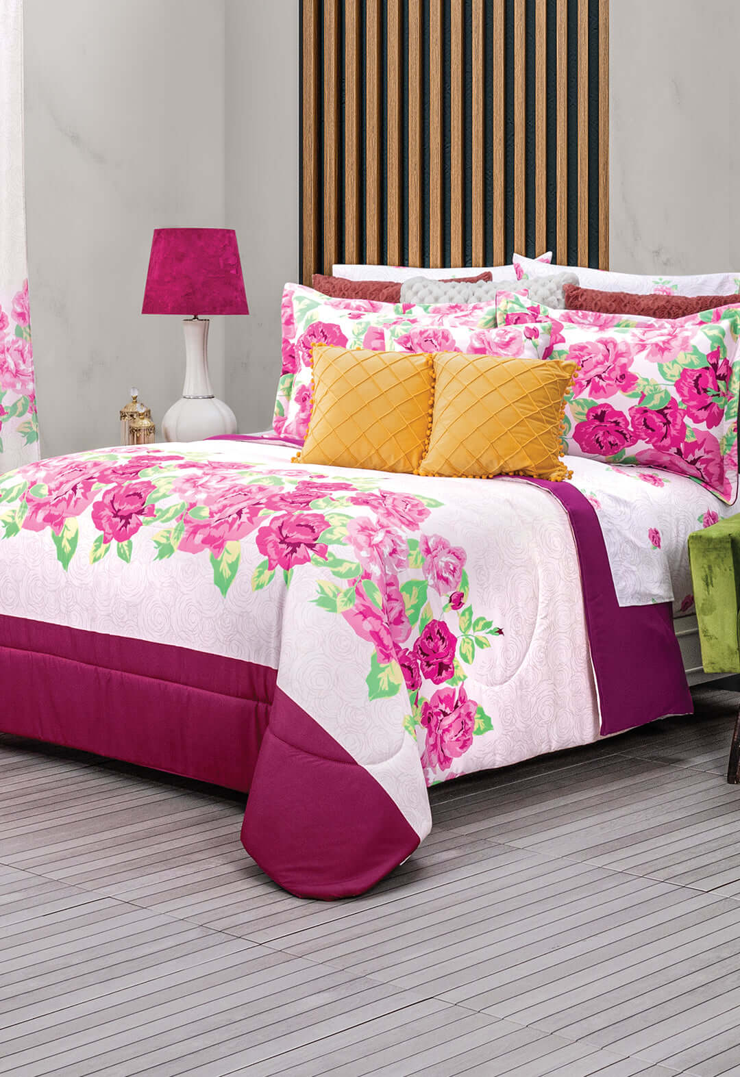 El coordinado de Edredon Eleonor es un completo e impactante juego reversible en color morado que incuye un hermoso juego de sabanas que combinan perfecto y realzaran la belleza de tu habitacion, ademas tienes la posibilidad de combinarlo con las cortinas Eleonor .