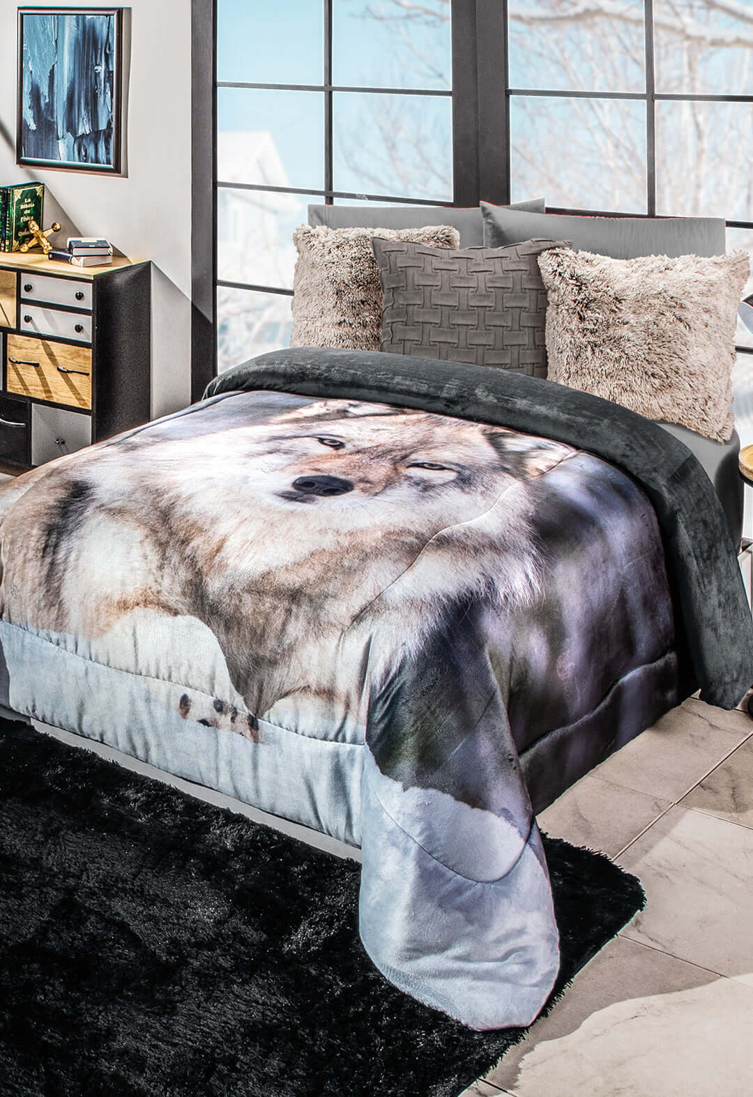Este cobertor ultra suave, con diseño de lobos en tonos neutros, refleja la fuerza silenciosa de la naturaleza. Su estilo sobrio con personalidad transforma la cama en un punto focal elegante y distintivo. Confeccionado en franela y estampado en alta definición, ofrece abrigo ligero, resistencia al lavado y calidez duradera.