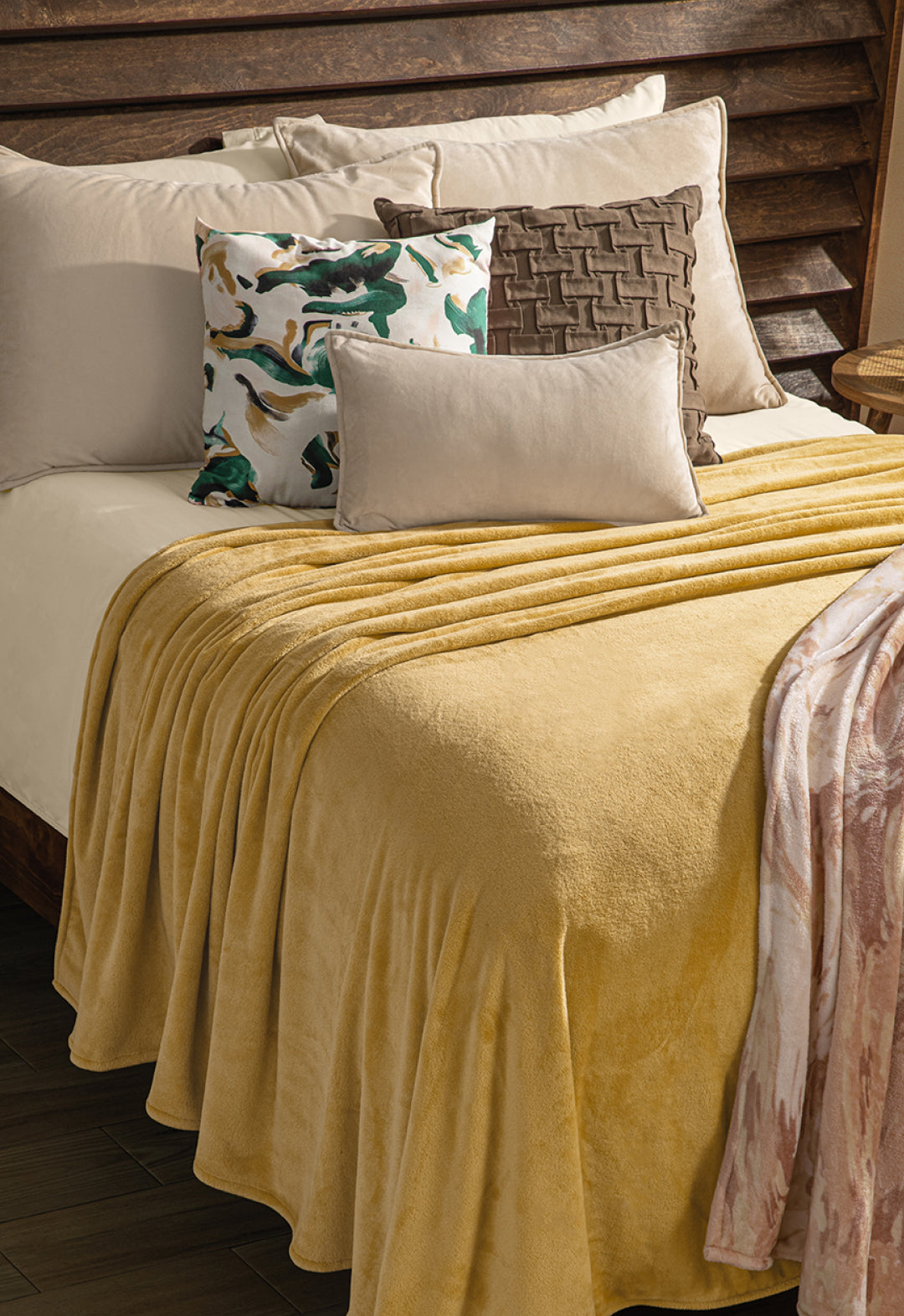 A neatly made bed with brown and mustard yellow bedding, accented by brown, white, and taupe pillows. The Cobertor Flannel Ligero Ontario Oro by Intima Hogar is draped over the foot, with nightstands and decor on each side.
