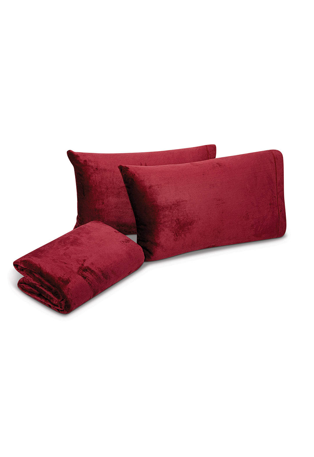 A tufted beige headboard frames a neatly made bed with the Juego de Sábanas Invernales Vino by Intima Hogar, surrounded by folded colorful towels on wooden side tables, set against a light-colored wall.