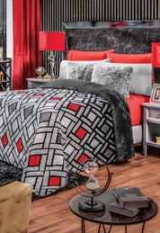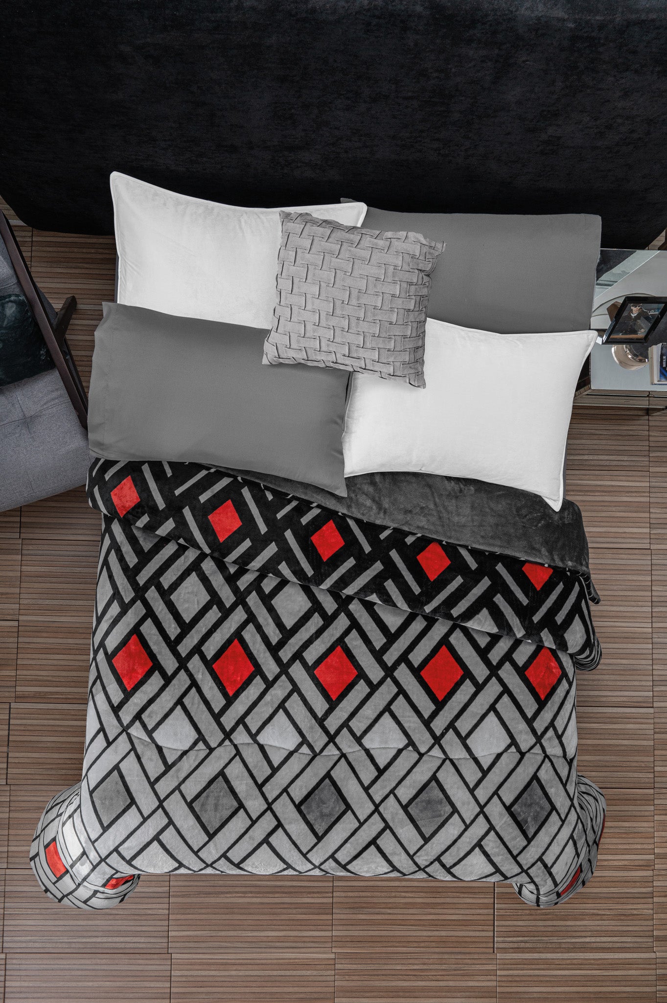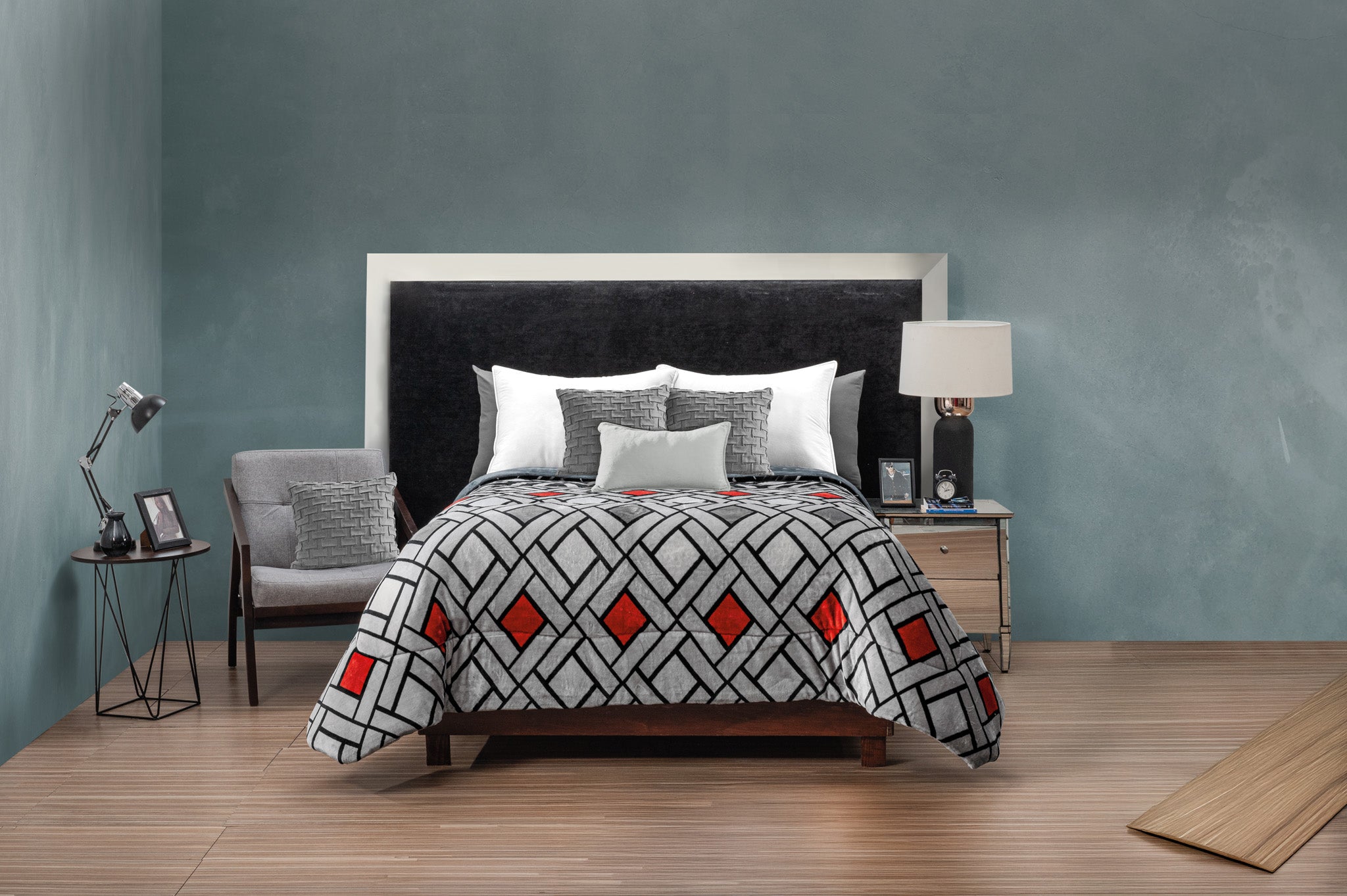 Cobertor con textura flannel de alta suavidad, en diseño geométrico moderno con toques sobrios. Ideal para espacios masculinos o minimalistas.
