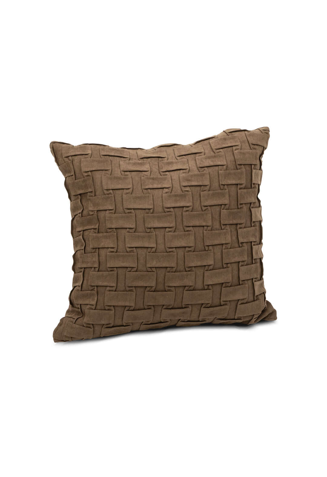 Un sofá beige decorado con cojines Brick Cafe de Intima Hogar en microfibra y relleno sintético. Frente al sofá, una mesa redonda de mimbre sostiene una vela blanca. Al fondo, la pared es lisa y clara.