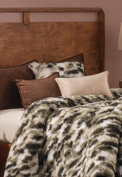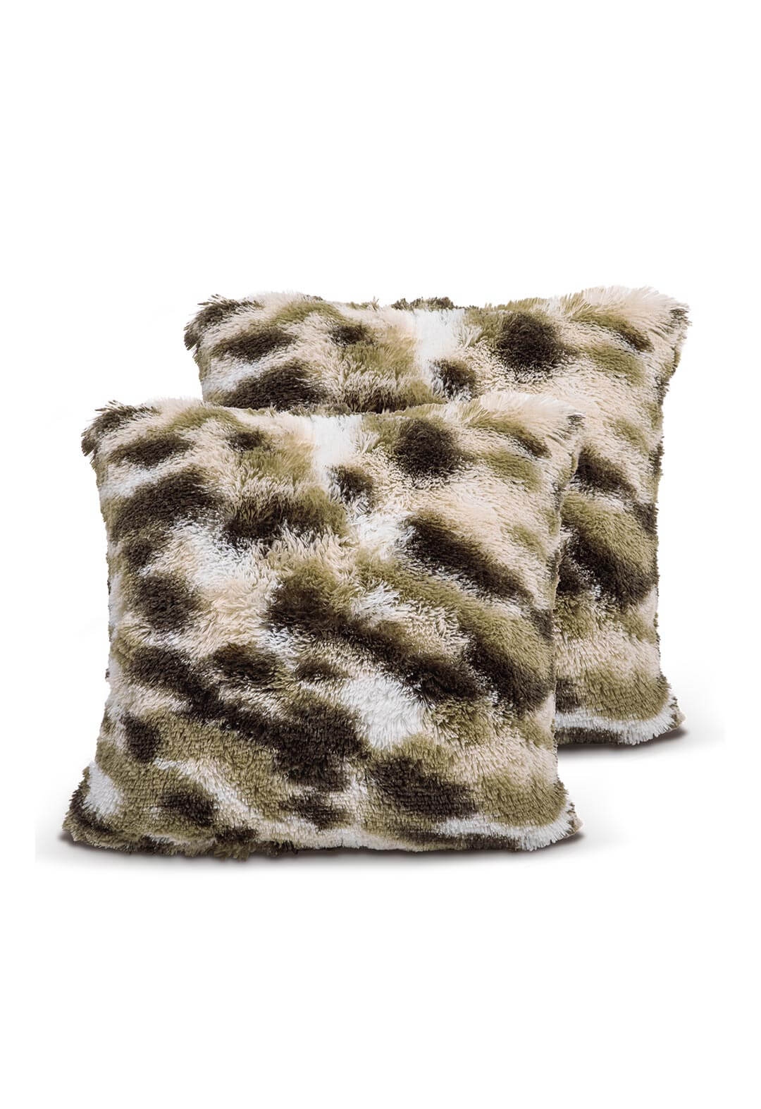 Dos cojines Juego de Cojines de Lujo Finlandia de Intima Hogar, en tonos verde y beige, decoran un sofá gris claro en una sala moderna con mesa de madera y arte abstracto.