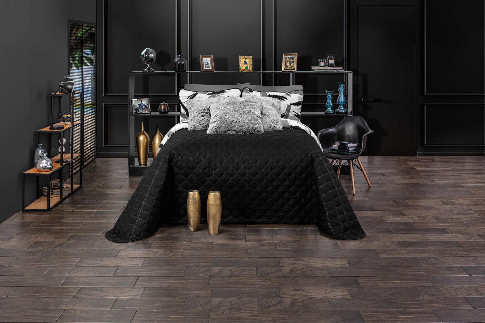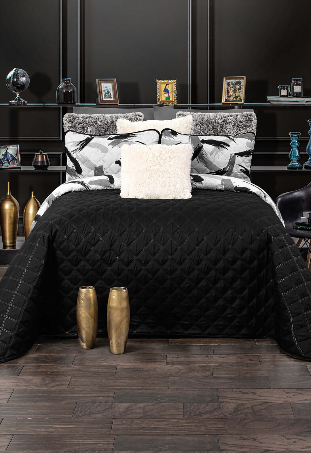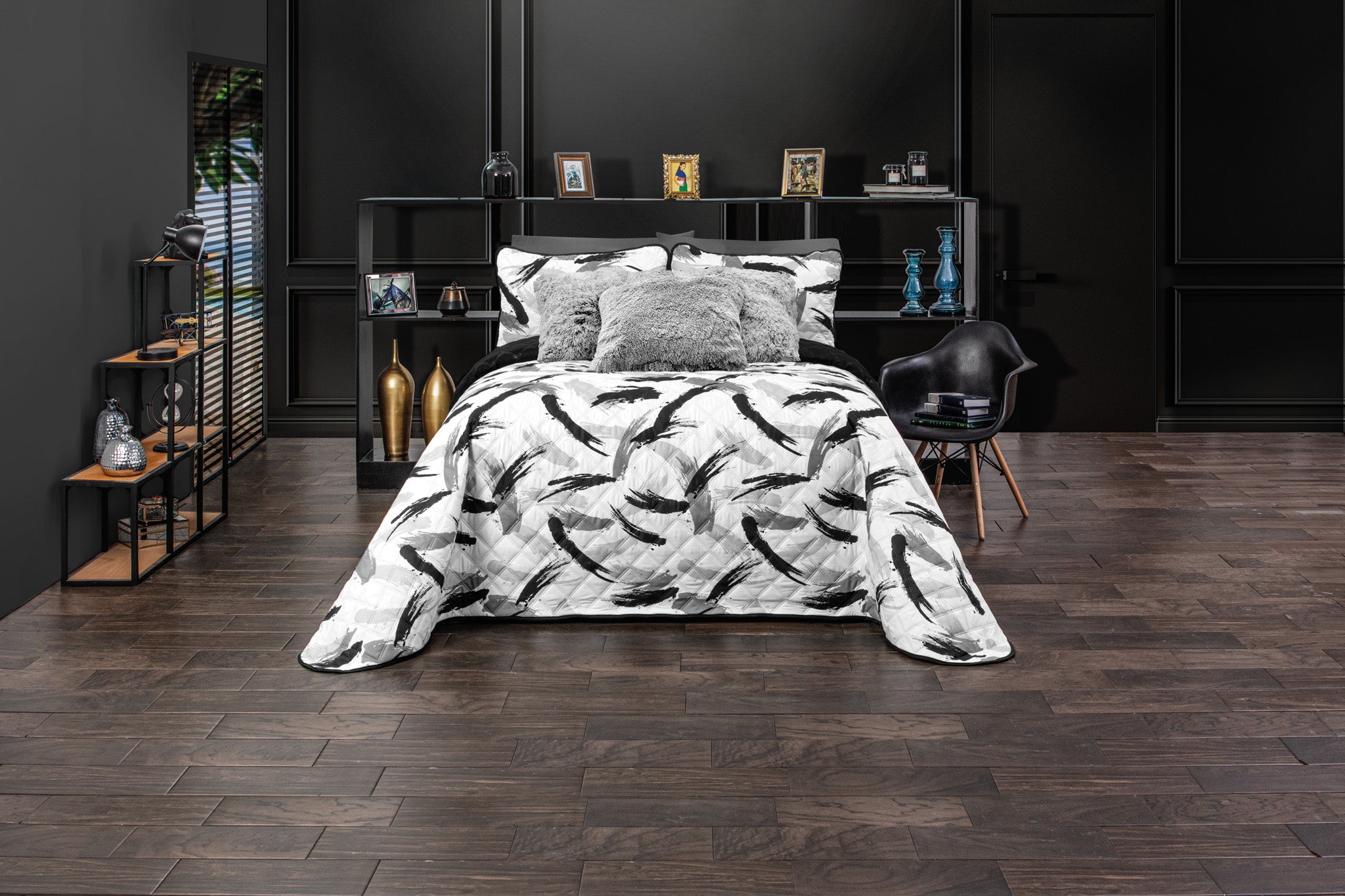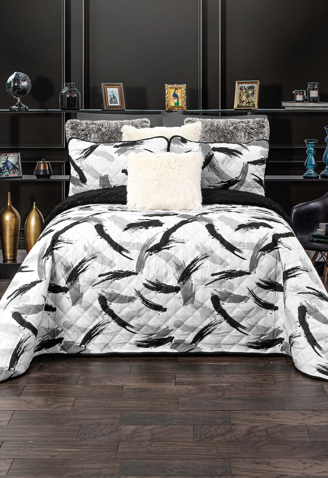 A modern recámara with a bed dressed in the Juego de Edredón Ultra Suave Brush by Intima Hogar, featuring white bedding and abstract black brushstroke pillows, plus a fluffy accent pillow, dark walls, decor shelves, and elegant dark wooden floors.