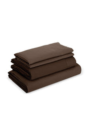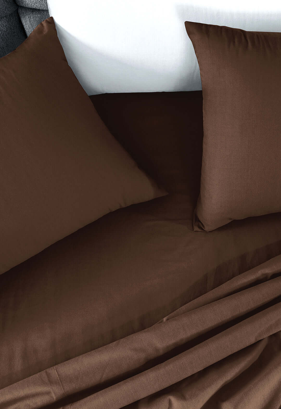 A neatly made bed features the Juego de Sábanas Acuarela Chocolate by Intima Hogar and two matching pillows on a light gray textured wall. The smooth microfibra fabric gives the bedding a luxurious, inviting appearance.